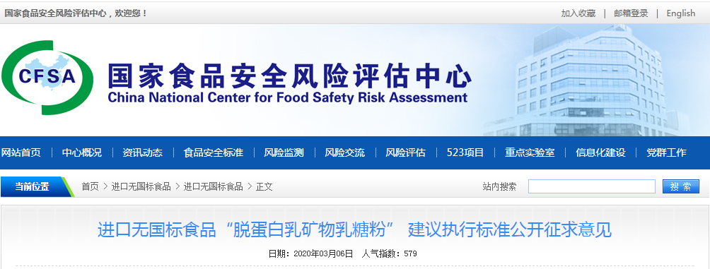 受國家衛生健康委員會委托,根據《食品安全法》和《國家衛生計生委辦公廳關于規范進口尚無食品安全國家標準審查工作的通知》要求,對擬按照進口尚無食品安全國家標準食品管理的“脫蛋白乳礦物乳糖粉”公開征求意見,請于20204月5日前將意見反饋至我中心,逾期將不予處理。