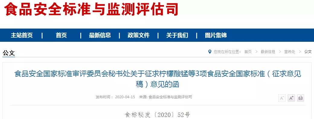 根據《食品安全法》及其實施條例規定,我委組織起草了《食品安全國家標準 檸檬酸錳》等3項食品安全國家標準(征求意見稿),現向社會公開征求意見。請于2020年6月6日前登錄食品安全國家標準管理信息系統(https://sppt.cfsa.net.cn:8086/cfsa_aiguo)在線提交反饋意見。